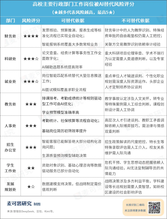 麦可思研究曾让DeepSeek对高校各职能部门岗位被AI替代的风险进行评分,整体来看,由于AI可承担大部分规则明确、流程标准化、高频重复操作工作,所以“数据密集型”部门的“风险评分”相对较高。而一些依赖非结构化沟通、创造性决策完成任务的部门被替代风险评分相对更低。