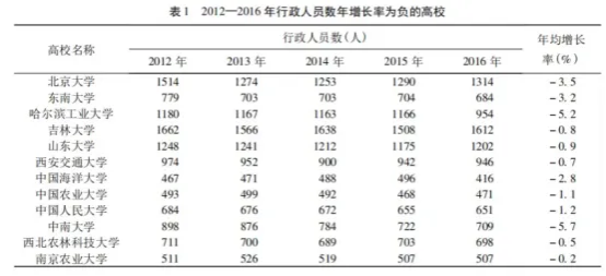 《现代大学治理体系视域下高校行政机构改革创新路径探究》一文中指出,通过对37所一流大学建设高校2012—2016年间行政人员数量的对比发现,约35%的高校行政人员数年增长率为负。这一数据充分表明,在这一时期,相当一部分中国高校已经敏锐地意识到行政人员规模优化的重要性,并采取了相应措施来控制行政人员数量的增长。