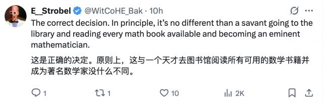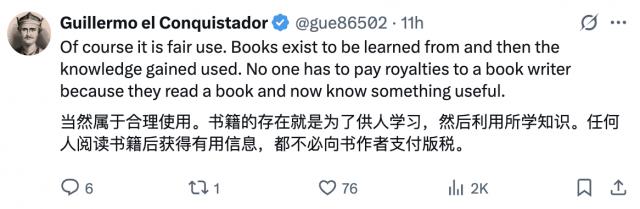 对此,不少网友的看法是这样的:既然人类读书并加以理解是毫无争议的,那 AI 读书并理解也应该合理。