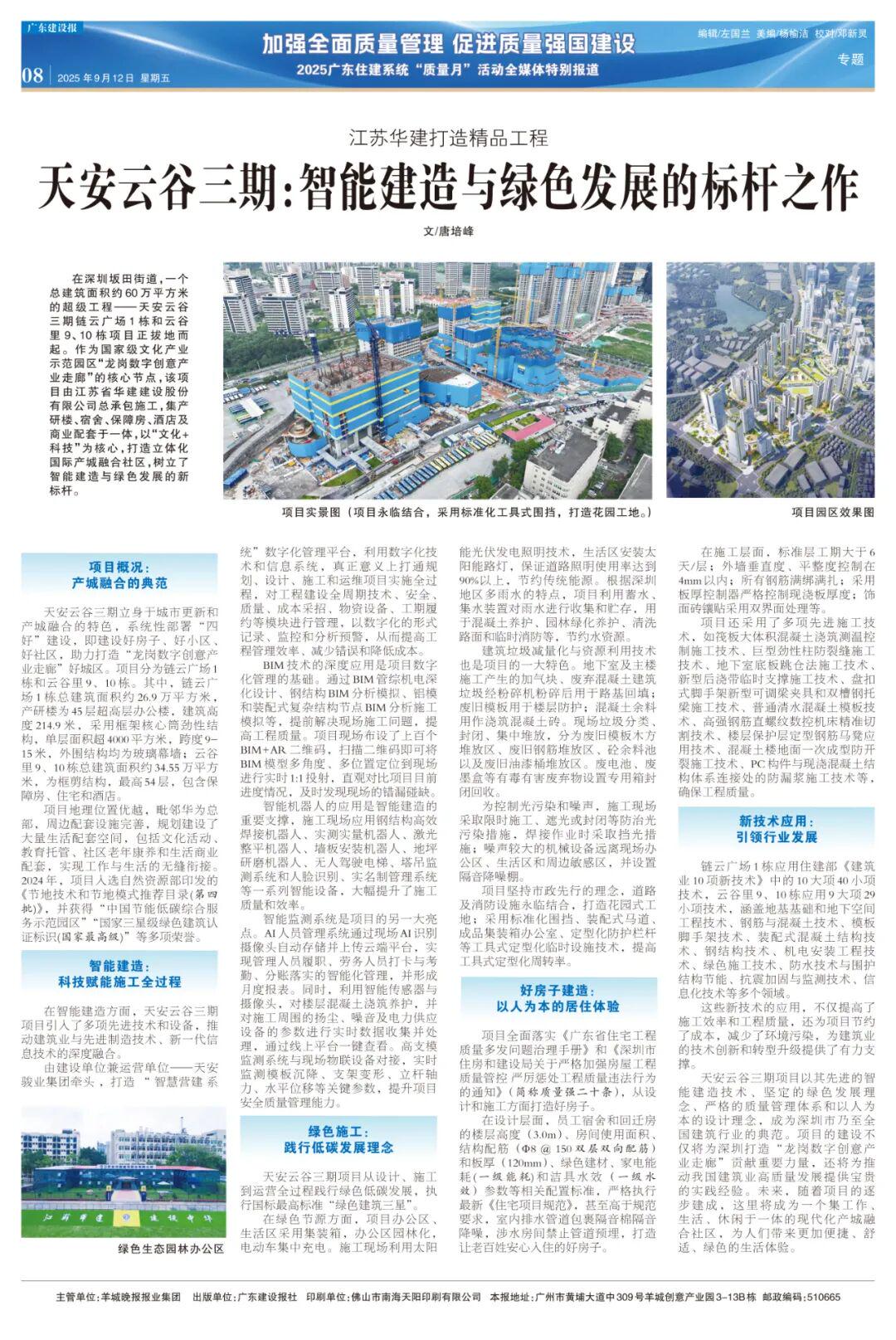 作为国家级文化产业示范园区“龙岗数字创意产业走廊”的核心节点,天安云谷三期链云广场1栋和云谷里9、10栋项目建筑面积60万平方米,由江苏省华建建设股份有限公司总承包施工,集产研楼、宿舍、保障房、酒店及商业配套于一体,以“文化+科技”为核心,打造立体化国际产城融合社区,树立了智能建造与绿色发展的新标杆。