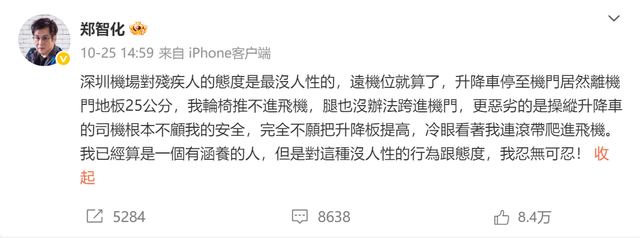 10月25日,郑智化发文指控“深圳机场对残疾人的态度是最没人性的”,表示升降车离机门地板25公分,轮椅推不进飞机,腿也没办法跨进机门,而司机不愿意把升降板提高,“冷眼看着我连滚带爬进飞机”。