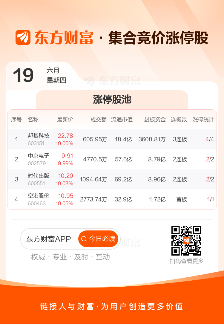 个股方面,4股竞价涨停,其中邦基科技3连板、中京电子2连板、时代出版2连板、空港股份首板。
